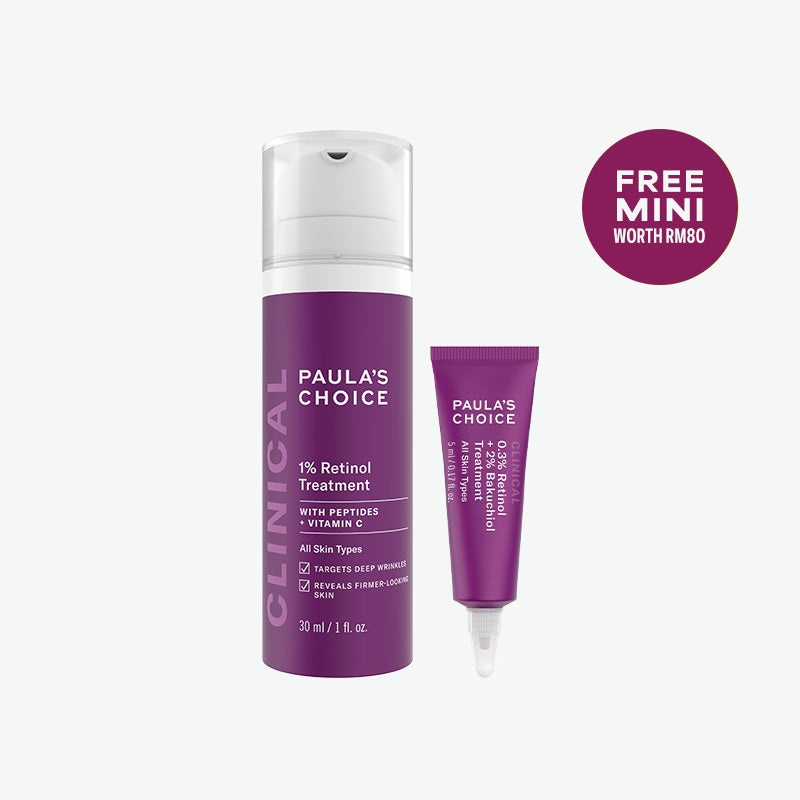 If sensitization occurs (redness, flaking, tenderness, or drying of skin), reduce frequency of use or mix one pump of the Clinical 1% Retinol Treatment with your favorite Paula’s Choice serum or PM moisturizer. If sensitization persists, discontinue use. Protect skin daily with sunscreen rated SPF 30 or greater.